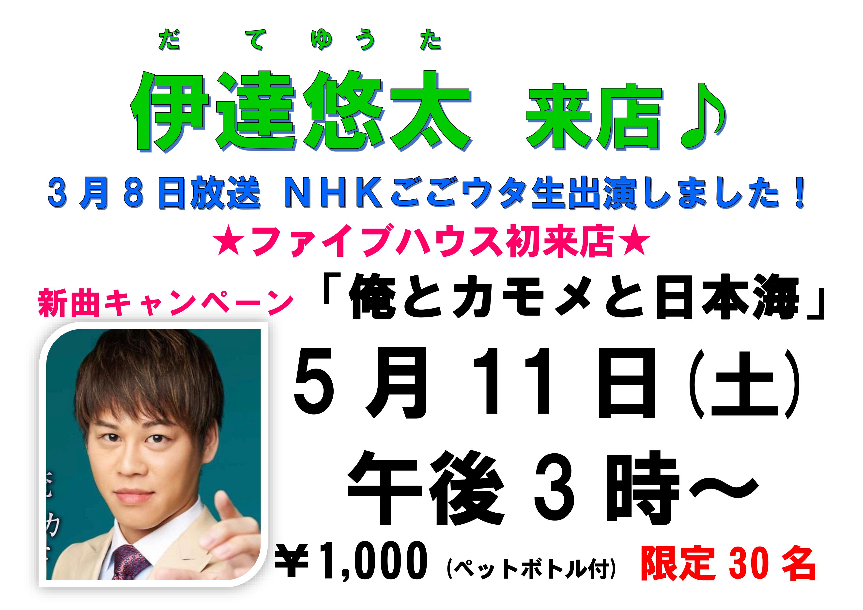 焼津市カラオケ喫茶ファイブハウス5月歌手イベント♪伊達悠太新曲キャンペーン明日来店♪
