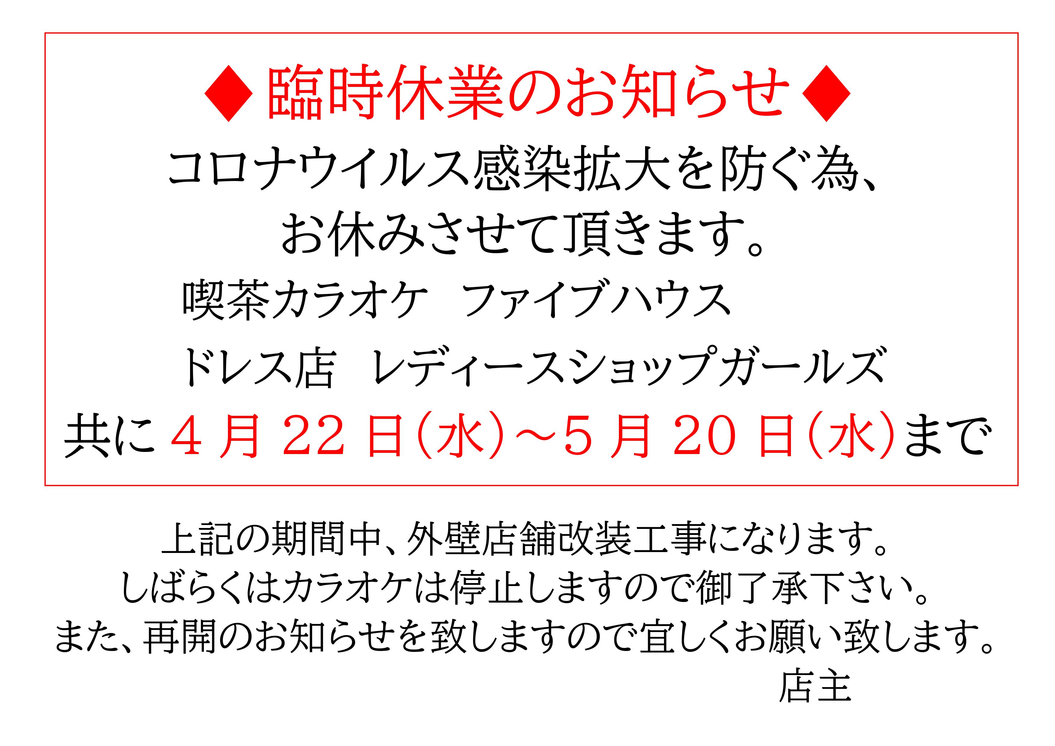 コロナウイルス拡大防止の為、臨時協業致します。 カラオケ喫茶ファイブハウス | 2020.04.20 大変申し訳ございませんが皆さんの身体の健康と自分の命も優先に自粛することに専念致します。 ページトップへ戻る 1 / 11