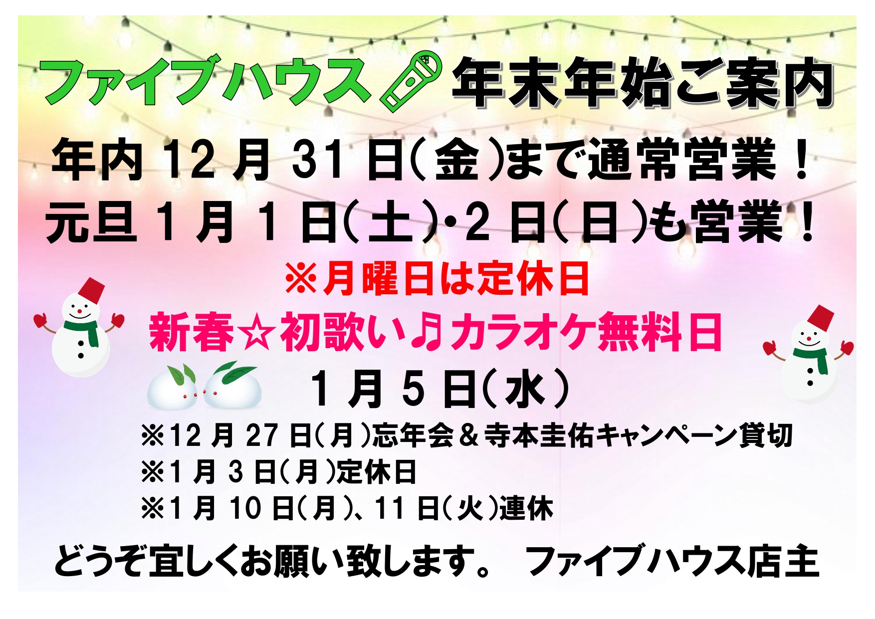 2021年☆ファイブハウス年末年始のご案内 カラオケ喫茶ファイブハウス | 2021.12.20 ページトップへ戻る 2021年☆ガールズ年末年始のご案内 レディースショップガールズ | 2021.12.20 ページトップへ戻る 1 / 11