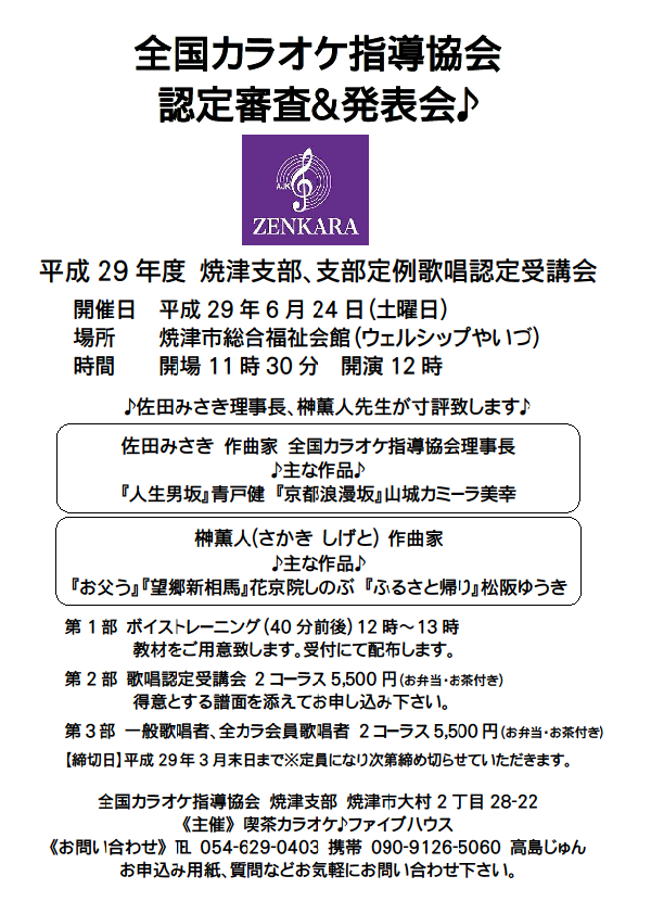 全国カラオケ指導協会・焼津支部・認定審査発表会 定員のお知らせ